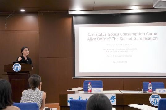 最后,丁丹副教授从当下时兴的游戏化领域出发,为同学们带来了一场活泼有趣、精彩纷呈的学术讲座:Can Status Goods Consumption Come Alive Online ?The Role Of Gamification ,报告内容充实丰富、涉及领域广泛,让营员全方面、多角度深入了解学术研究的完整历程,启发营员们深入思考管理科学与工程学科的发展前沿与应用场景,引导大家关注实际,强调管理科学与工程学科素养对于发现问题、解决问题的重要性。