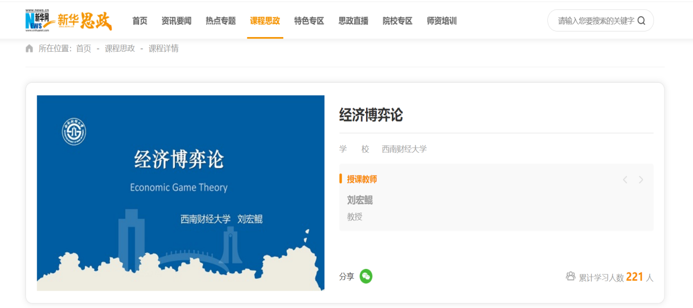 2022年7月22日, 太阳成集团tyc33455cc教师刘宏鲲教授主讲的“经济博弈论”在“新华思政”(全国高校课程思政教学资源服务平台)上线,面向全社会开放共享。